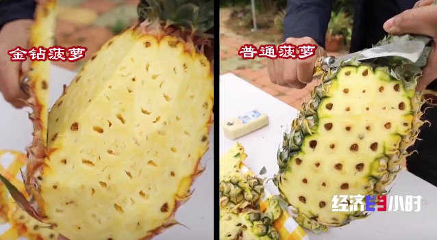 2017年陳如約開始引進種植的“金鉆”菠蘿,也是眼下賣得最火的品種。標準化、精細化培育的金鉆菠蘿和普通菠蘿不光外觀差異明顯,而且果眼較淺不用挖掉,也不用泡鹽水,食用起來更加方便。