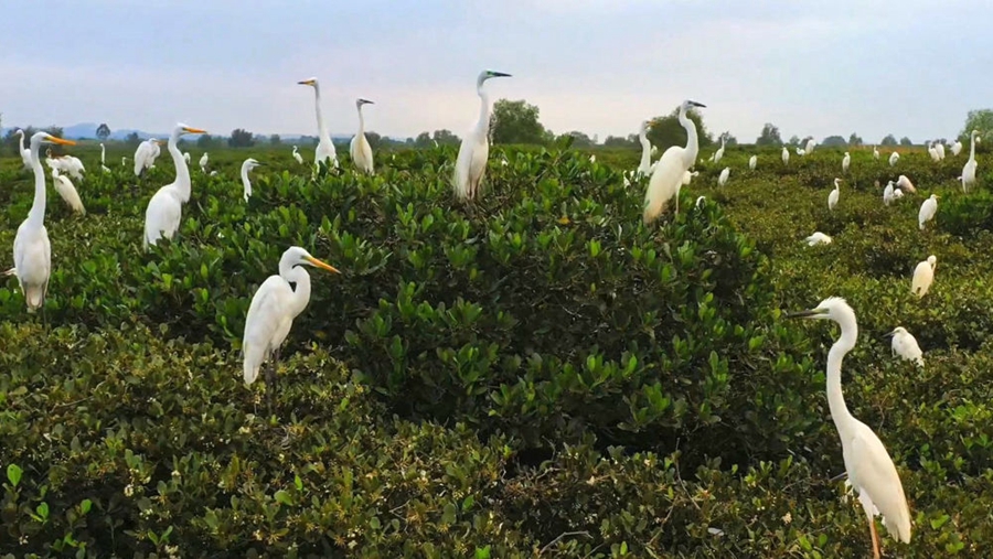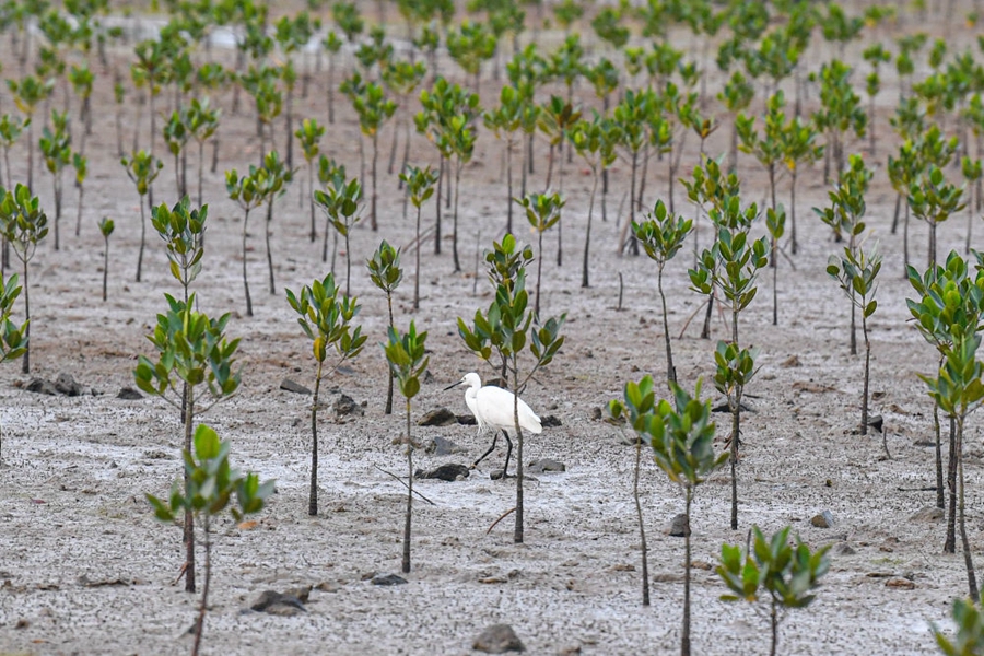 ↑鷺鳥在海南儋州市新英鹽場(chǎng)濕地人工栽種的紅樹林間覓食(2022年11月8日攝)。