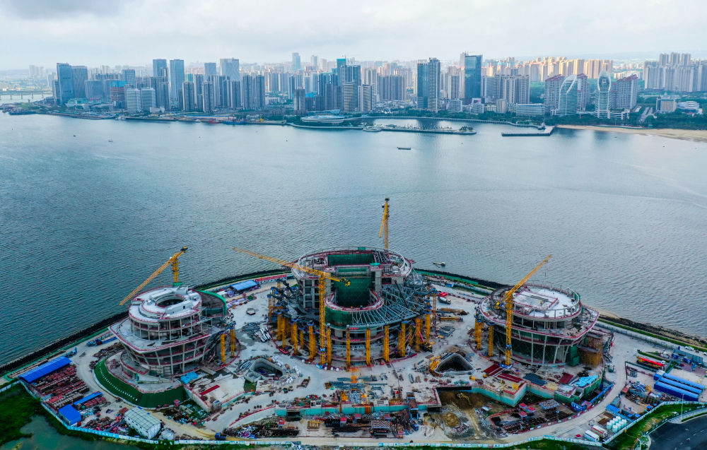 中建深裝承建的湛江市文化中心三館開始安裝幕墻,建成后這里將成為湛江文化新地標(5月26日攝,無人機照片)。新華社記者 劉大偉 攝