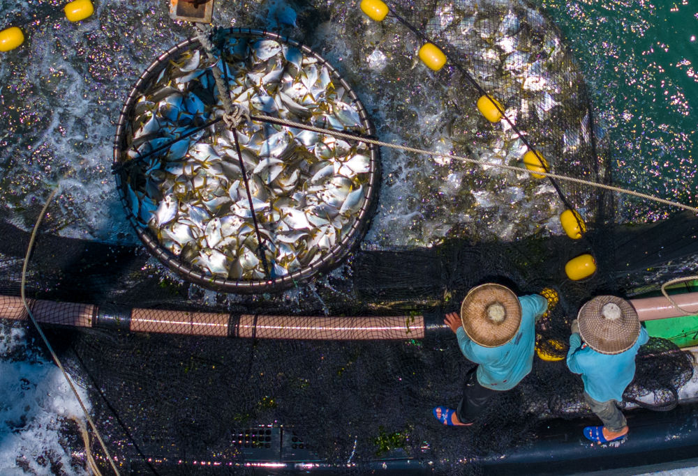 5月27日,在湛江徐聞西連鎮(zhèn),漁業(yè)工人從深海網(wǎng)箱中打撈金鯧魚(無人機照片)。新華社記者 毛思倩 攝