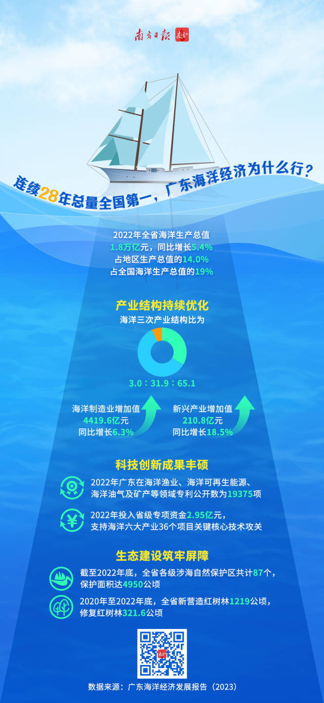 6月6日,《廣東海洋經(jīng)濟發(fā)展報告(2023)》(以下簡稱《報告》)正式發(fā)布!秷蟾妗凤@示,廣東海洋經(jīng)濟總量已連續(xù)28年居全國首位。據(jù)初步核算,2022年廣東海洋生產(chǎn)總值1.8萬億元,同比增長5.4%,占地區(qū)生產(chǎn)總值的14%,占全國海洋生產(chǎn)總值的19%。