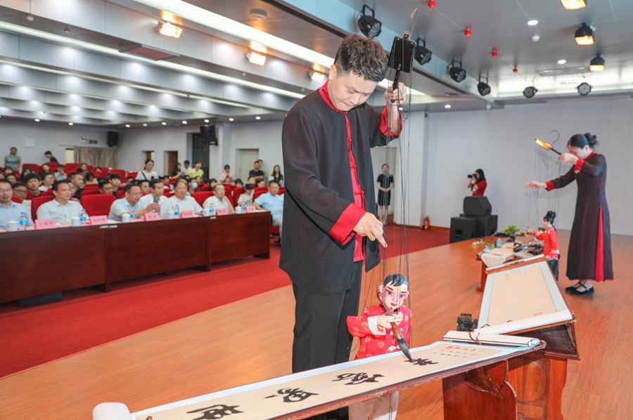 首屆移動(dòng)杯梅州客家非遺文創(chuàng)設(shè)計(jì)大賽啟動(dòng)儀式木偶書(shū)法作品展示。吳騰江 攝