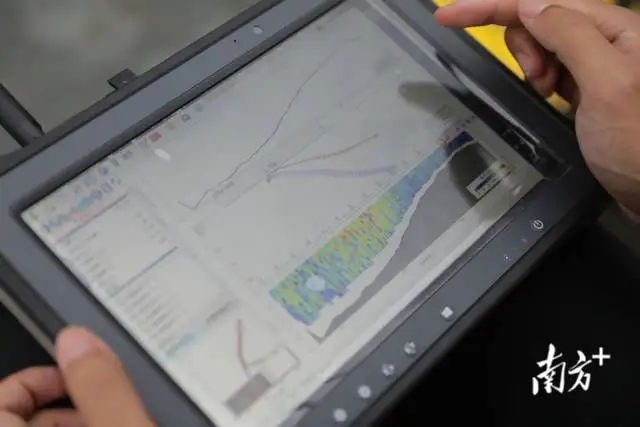 在涌浪之中,測量船向江心駛去:一人負責掌舵,及時避讓水面上的樹木、竹頭等漂浮物;一人負責保護搭載監(jiān)測設備的三體船,避免撞船或卷入漩渦;一人負責監(jiān)測船載走航式聲學多普勒流速剖面儀,確保儀器正常工作、數據采樣精準。