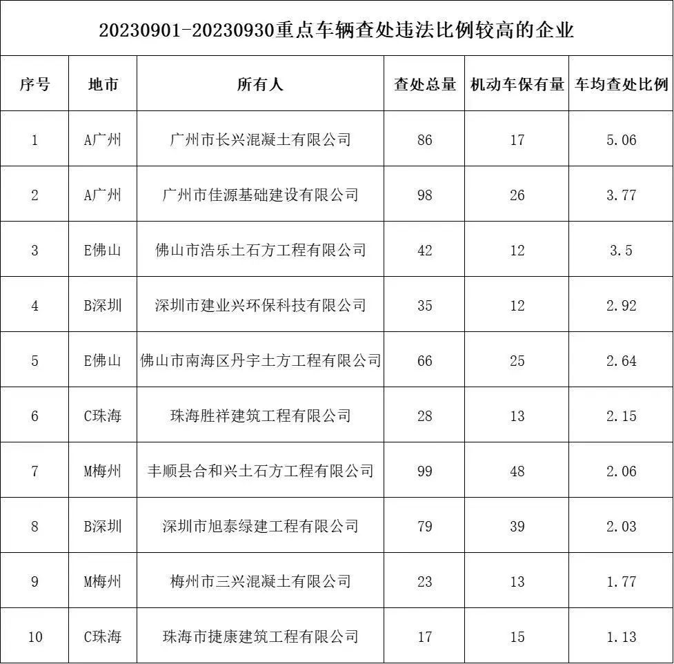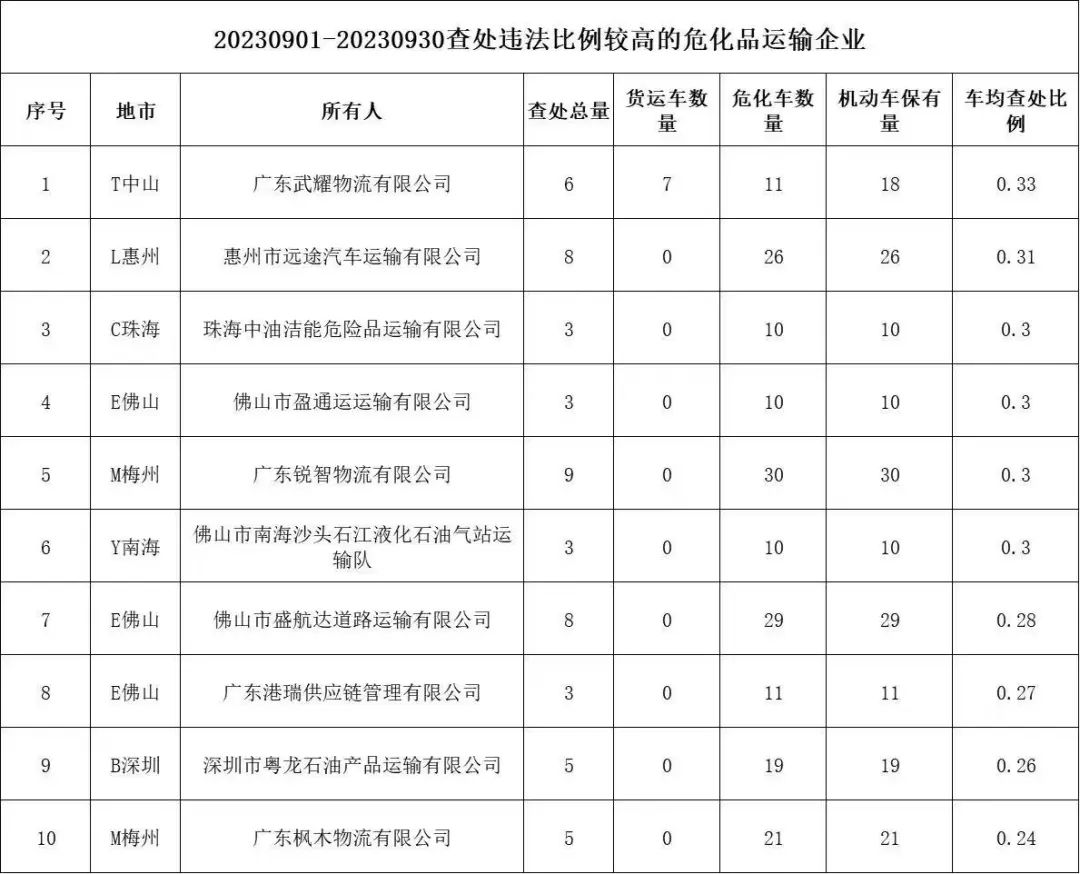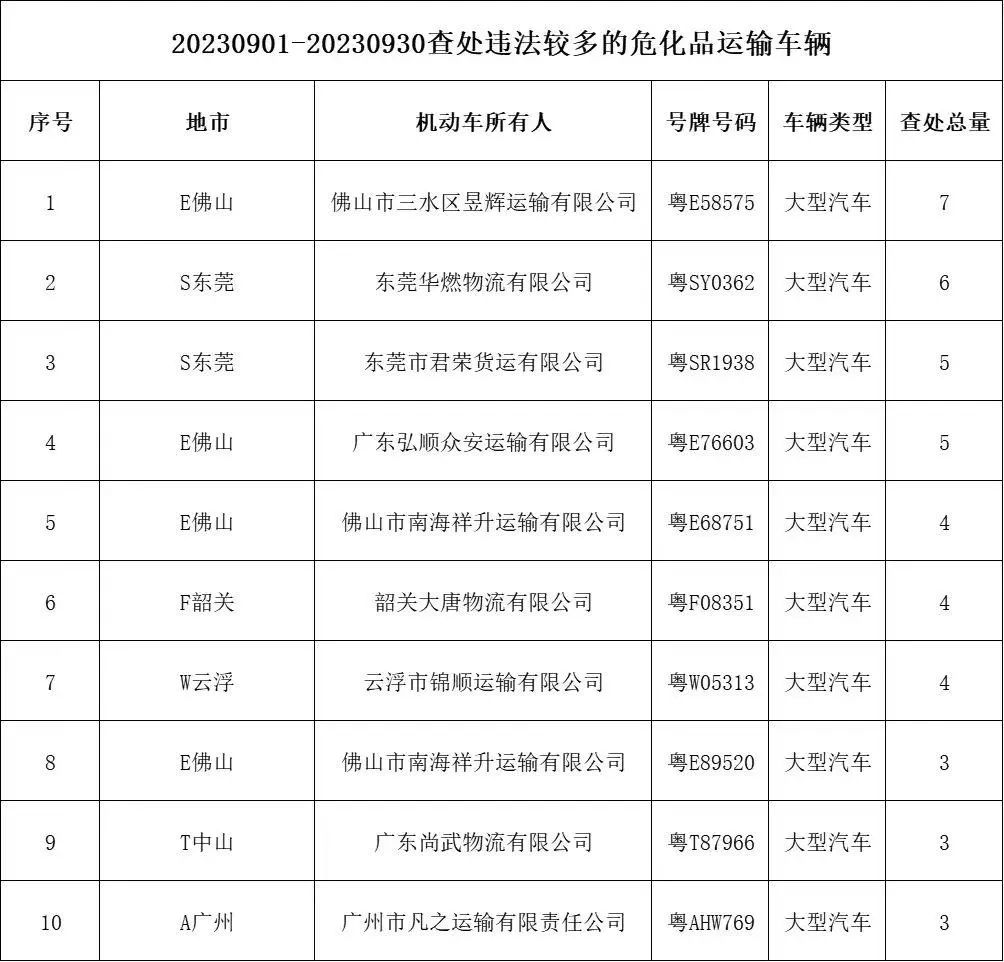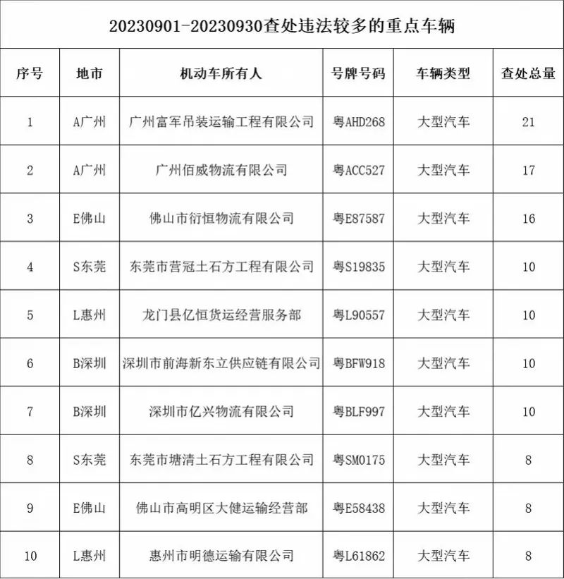 違法較多的;愤\輸車輛包括佛山市三水區(qū)昱輝運輸有限公司的粵E58575、東莞華燃物流有限公司的粵SY0362等10輛,其中粵E58575單月來違法總量達7次。