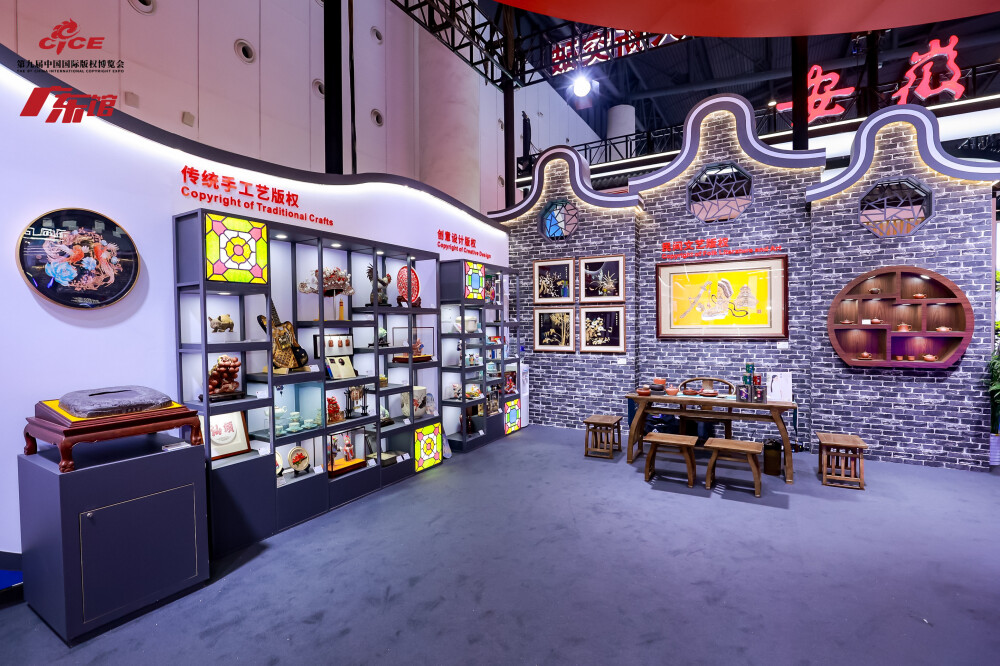 展館內(nèi),高1.85米重363斤的茂名猛犸牙雕作品《天地同春》,高2.13米重610斤的茂名猛犸牙雕作品《大遷徙》,體現(xiàn)了創(chuàng)作者高超的技藝與深厚的文化功底,是當(dāng)之無(wú)愧的“鎮(zhèn)館之寶”;中國(guó)工藝美術(shù)大師黃偉雄的潮州珠繡《郁金香》,展現(xiàn)出底蘊(yùn)深厚的東方文化和民族魅力;獲得今年第36屆中國(guó)電影金雞獎(jiǎng)“最佳戲曲片”獎(jiǎng)項(xiàng)的粵劇電影《譙國(guó)夫人》,為觀眾帶來(lái)了震撼的視覺(jué)體驗(yàn),人們仿佛穿梭于異次元時(shí)空,感受嶺南文化魅力。另外,館內(nèi)還集中展示了廣東省各地市選送的優(yōu)秀版權(quán)展品,如中國(guó)工藝美術(shù)大師張炳光的作品翡翠玉雕《四大發(fā)明》、佛山非遺“銅鑿剪紙”《錦戲英華》、中國(guó)刺繡藝術(shù)大師祝書(shū)琴的作品潮州抽紗《鳳福齊天》等。