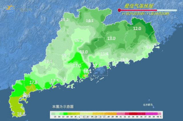 28日,西部市縣晴間多云,中東部市縣晴間少云。最低氣溫:粵北的北部市縣11℃~15℃,南部沿海市縣18℃~21℃,其余市縣14℃~18℃。
