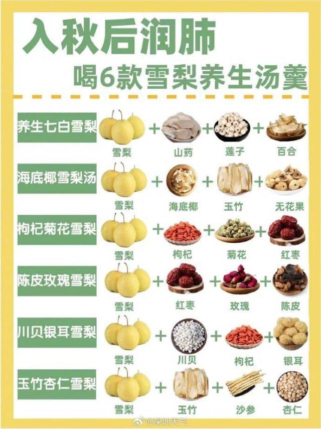 自從入秋以后,秋燥逐漸明顯,往往會(huì)造成皮膚干,嗓子干,容易上火。@深圳天氣同學(xué),給大家?guī)黻P(guān)于雪梨的六種養(yǎng)生湯、養(yǎng)生茶的常見搭配。大家記得收藏起來煲點(diǎn)靚湯,煮點(diǎn)靚茶, 嘆下“秋”先啦!