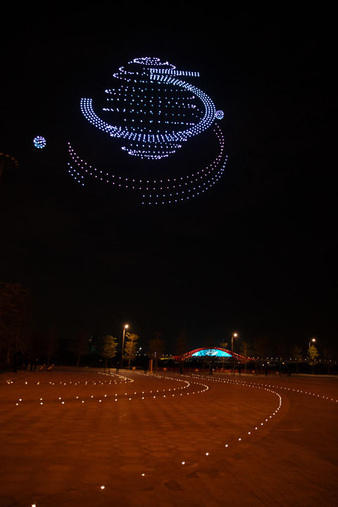 這是12月2日晚在廣州南沙國(guó)際金融論壇永久會(huì)址拍攝的世界媒體峰會(huì)無(wú)人機(jī)表演。新華社記者 金立旺 攝