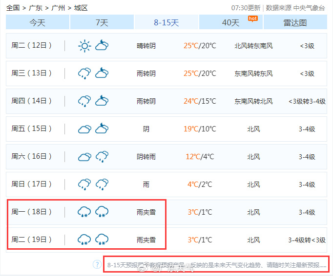昨天,不少網(wǎng)友從“8-15天趨勢(shì)預(yù)報(bào)”中發(fā)現(xiàn)廣州12月中下旬有雨夾雪。