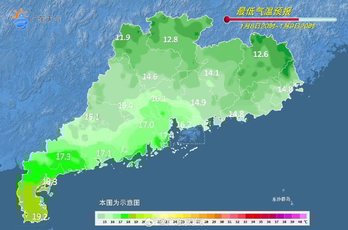9日,中北部市縣多云到陰天,有小到中雨局部大雨,其余市縣多云間陰天,有分散小雨。早晨最低氣溫:粵北和粵東市縣10℃~13℃,珠江口附近和粵西市縣17℃~20℃,其余市縣14℃~16℃。