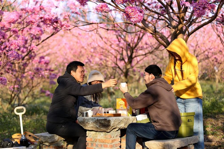 在江門市新會(huì)區(qū)大澤鎮(zhèn)山頭坪,游客在花海中泡茶(2023年1月29日攝)。新華社發(fā)(黃繼明攝)