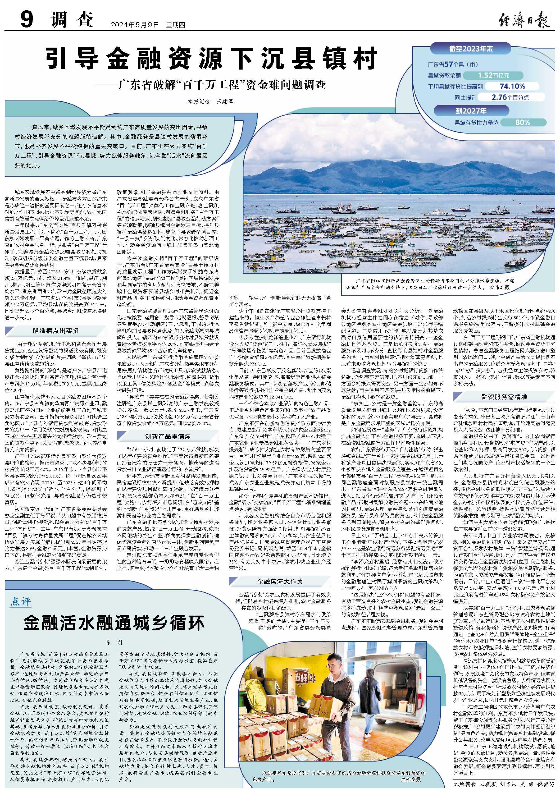 如何改變這一局面?廣東省委金融委員會辦公室副主任于海平說,“從問題中有效瞄準(zhǔn)痛點,創(chuàng)新體制機制建設(shè),以金融之力夯實‘百千萬工程’基礎(chǔ)樁”。去年,廣東出臺《關(guān)于金融支持“百縣千鎮(zhèn)萬村高質(zhì)量發(fā)展工程”促進(jìn)城鄉(xiāng)區(qū)域協(xié)調(diào)發(fā)展的實施方案》,提出到2027年縣域存貸比力爭達(dá)80%,金融產(chǎn)品更加豐富,金融資源持續(xù)下沉,縣鎮(zhèn)村金融需求得到較好滿足。