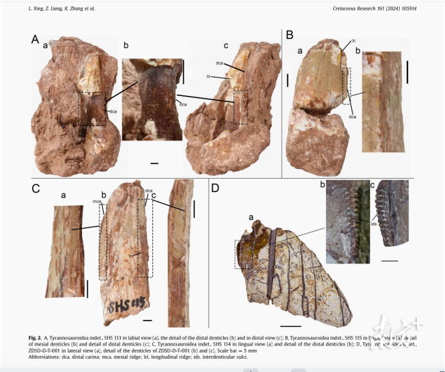 研究團(tuán)隊(duì)近兩年來針對(duì)這些牙齒的形態(tài)特征進(jìn)行了系統(tǒng)發(fā)育分析和判別分析,結(jié)果支持四顆牙齒屬于暴龍超科。研究人員表示:“保守估計(jì),四會(huì)發(fā)現(xiàn)的暴龍超科牙齒所屬個(gè)體體長約5米—6米,廣州市區(qū)的則可能是更大一些的個(gè)體!