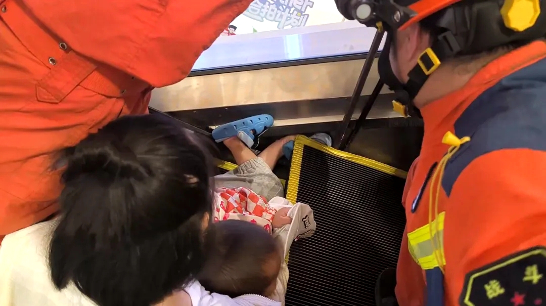 韶關(guān)一男童右腳被扶梯“咬”住了