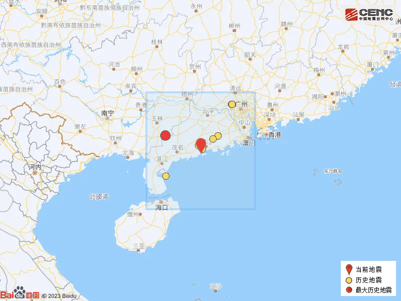 歷史地震:根據中國地震臺網速報目錄,震中周邊200公里內近5年來發(fā)生3級以上地震共9次,最大地震是2019年10月12日在廣西玉林市北流市發(fā)生的5.2級地震(距離本次震中142公里),歷史地震分布如圖。