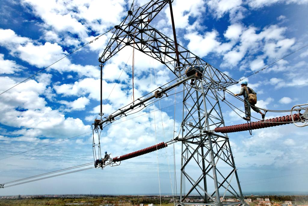 臺風后,搶修人員正在對湛江徐聞重點線路——500千伏福徐線受損跳線以及絕緣子進行緊急更換。(廣東電網(wǎng)供圖)