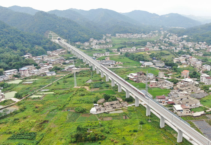 9月13日,復(fù)興號(hào)試驗(yàn)列車行駛在龍龍高鐵梅龍段葉屋特大橋上。