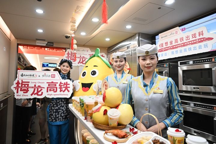 9月14日,鐵路工作人員在G8491次列車上慶祝龍龍高鐵梅龍段開通運(yùn)營(yíng)。
