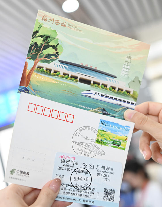 9月14日,旅客在梅州西站手持郵政明信片和車票慶祝龍龍高鐵梅龍段開通運(yùn)營(yíng)。