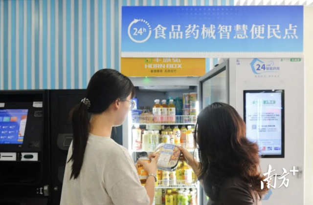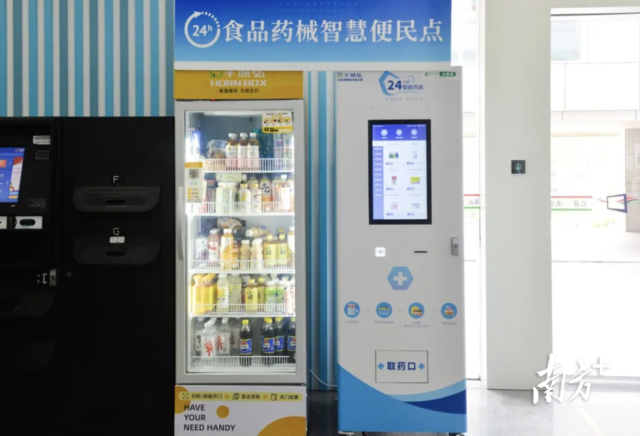 食品藥械24小時智慧售賣,便捷服務不打烊……在便民點,有兩臺自助售貨機,一臺銷售零食、飲料;另一臺“24小時智慧藥房”,銷售范圍涵蓋57種藥械包括解熱鎮(zhèn)痛、跌打損傷等乙類非處方藥,以及不需專人指導使用的第一、二類醫(yī)療器械。市民群眾通過簡潔操作界面就能快速選購,“無感支付、即拿即走”,滿足24小時購藥需求。