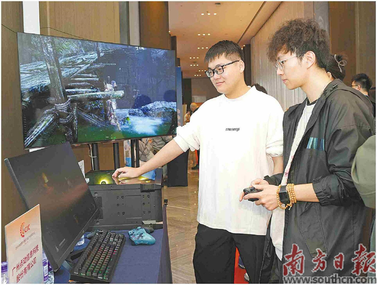 在展示區(qū),廣州的點(diǎn)動(dòng)信息科技通過(guò)游戲《黑神話:悟空》向與會(huì)嘉賓展示公司服務(wù)器和云游戲等產(chǎn)品的性能。南方日?qǐng)?bào)記者 仇敏業(yè) 攝