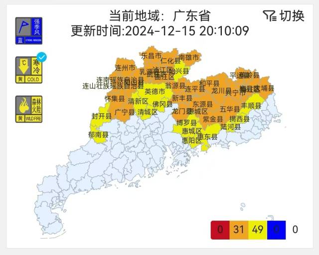 截至15日19時30分,全省已啟動31個寒冷橙色預(yù)警和49個寒冷黃色預(yù)警,主要覆蓋粵北、珠三角東北部和粵東北部市縣。另外,我省大部干燥天氣維持,各地的森林火險預(yù)警信號均繼續(xù)生效中。