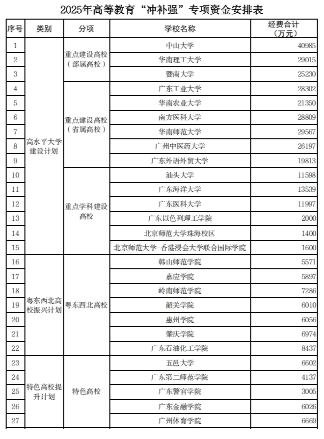 12月18日,廣東省教育廳公示了2025年高等教育“沖一流、補短板、強特色”專項資金安排方案,擬投入41.1億元支持35所本科高!皼_補強”。記者了解到,與去年共安排42.5億元相比,今年的資金總額略有下降。