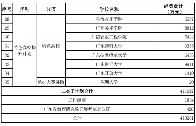 在高水平大學建設計劃中,共有15所本科高校獲得資金支持,其中8所高校獲得超2億元資金。在粵東西北高校振興計劃中,獲得資金支持的高校有7所,其中廣東石油化工學院獲得資金最多,為8437萬元。特色高校提升計劃中,獲得資金最多的是廣東藥科大學,獲得了9355萬元的資金。