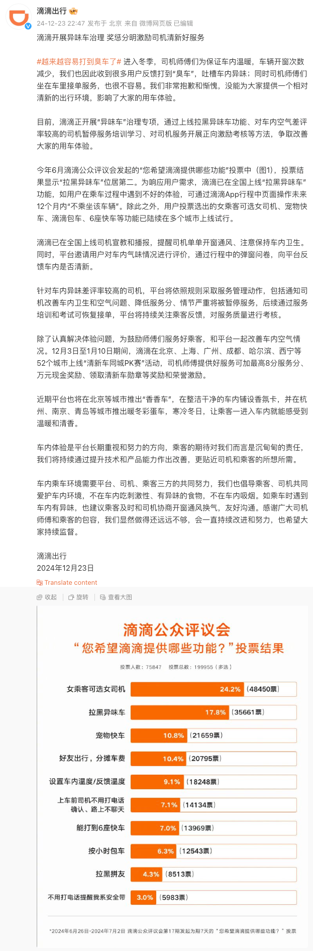 12月23日晚,@滴滴出行 發(fā)文稱,進入冬季,司機為保證車內(nèi)溫暖,車輛開窗次數(shù)減少,滴滴也因此收到很多用戶反饋打到“臭車”,吐槽車內(nèi)異味。