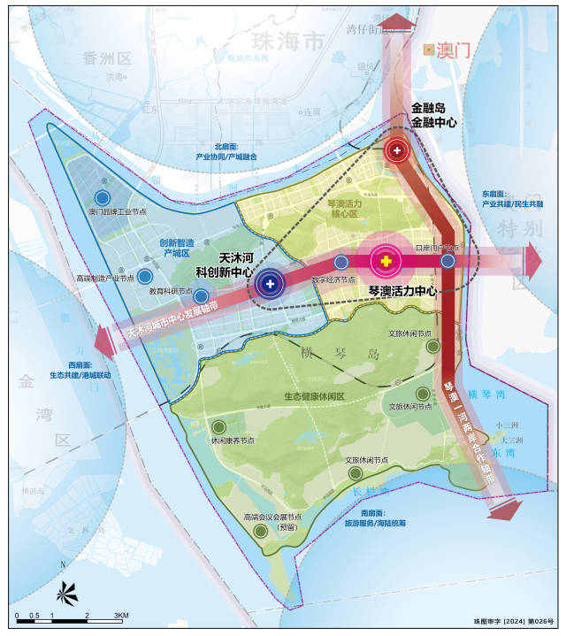 在空間格局上,《規(guī)劃》明確了對接澳門北部城市功能、南部綠色休閑的整體空間結(jié)構(gòu),塑造合作區(qū)“北城南野、差異共生”的國土空間整體格局;圍繞十字軸帶(琴澳一河兩岸合作軸帶、天沐河城市中心發(fā)展軸帶),三大片區(qū)(琴澳活力核心區(qū)、創(chuàng)新智造產(chǎn)城區(qū)、生態(tài)健康休閑區(qū)),三大中心(琴澳活力中心、金融島金融中心、天沐河科創(chuàng)新中心),構(gòu)建“十字軸帶、三大片區(qū)、三心多點”的空間結(jié)構(gòu)。