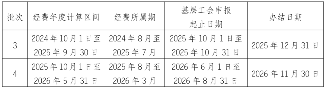 按照新的政策時限,對《關(guān)于實施小額繳費工會組織工會經(jīng)費全額返還支持政策的通知》中的第3批次進行調(diào)整,并新增第4批次,具體如下: