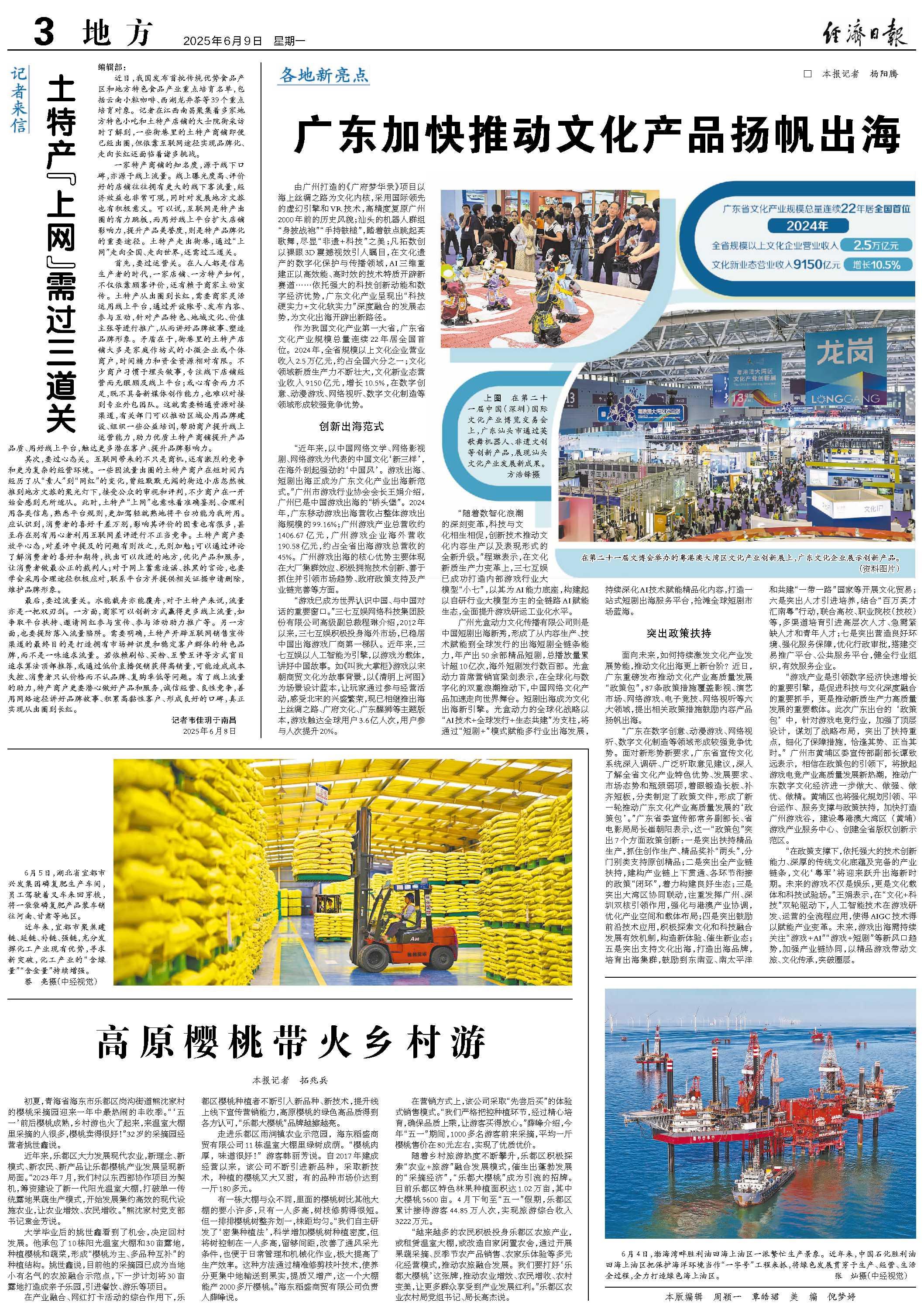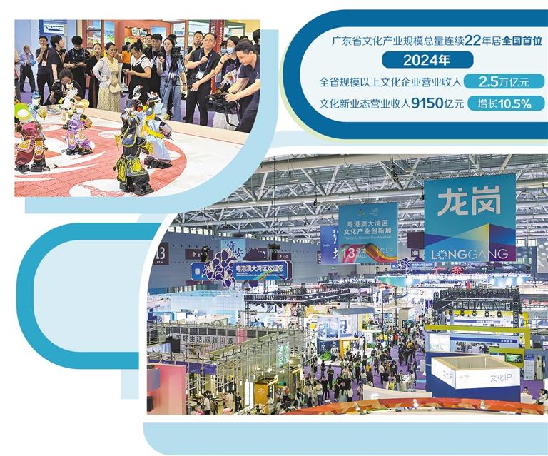 作為我國文化產(chǎn)業(yè)第一大省,廣東省文化產(chǎn)業(yè)規(guī)?偭窟B續(xù)22年居全國首位。2024年,全省規(guī)模以上文化企業(yè)營業(yè)收入2.5萬億元,約占全國六分之一;文化領(lǐng)域新質(zhì)生產(chǎn)力不斷壯大,文化新業(yè)態(tài)營業(yè)收入9150億元,增長10.5%,在數(shù)字創(chuàng)意、動漫游戲、網(wǎng)絡(luò)視聽、數(shù)字文化制造等領(lǐng)域形成較強競爭優(yōu)勢。