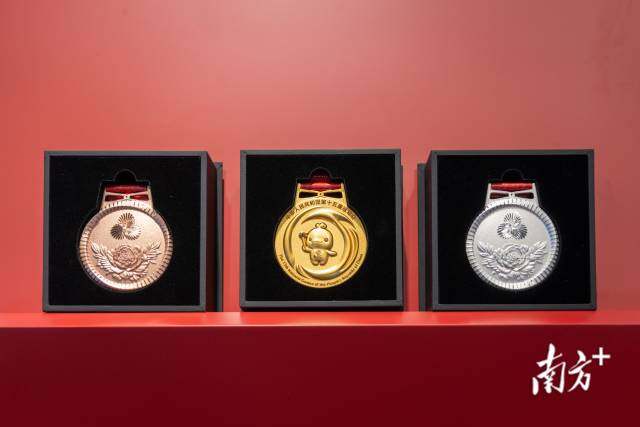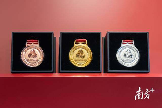 獎(jiǎng)牌的一面,十五運(yùn)會(huì)的會(huì)徽以三組遞進(jìn)式層次的立體結(jié)構(gòu)呈現(xiàn),突顯三地禮花元素。“會(huì)徽的位置在中偏上,象征旭日東升。而在會(huì)徽的正下方,我們用牡丹象征祖國(guó),詮釋粵港澳大灣區(qū)在祖國(guó)的懷抱中蓬勃發(fā)展,綻放于世界舞臺(tái)!