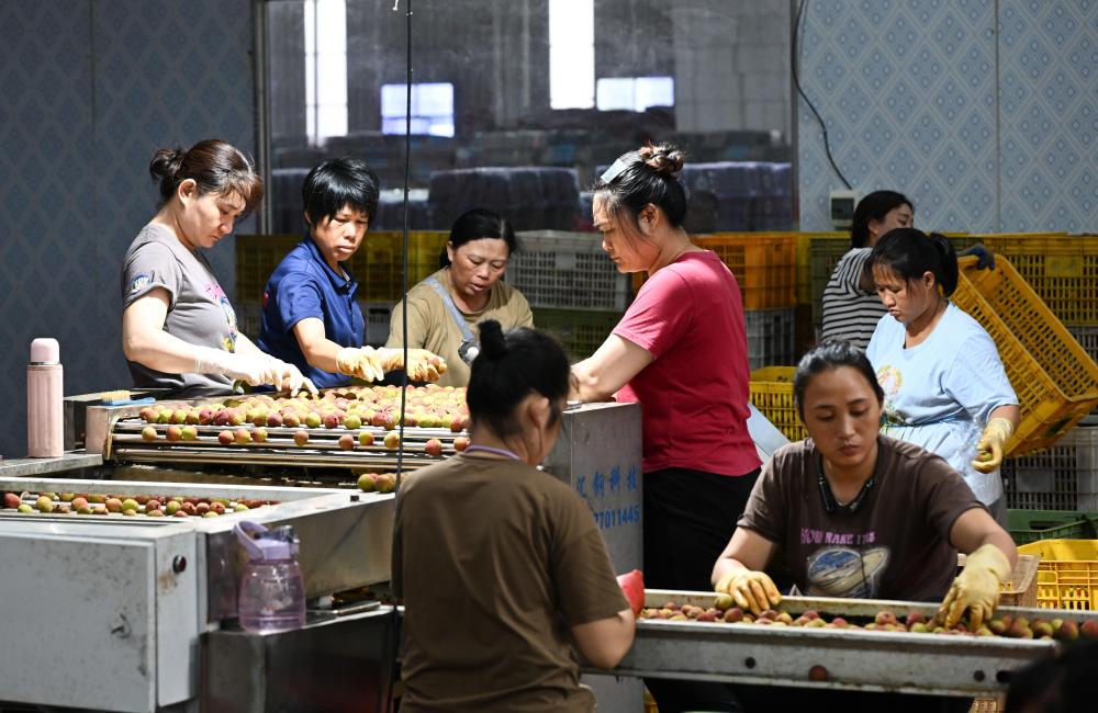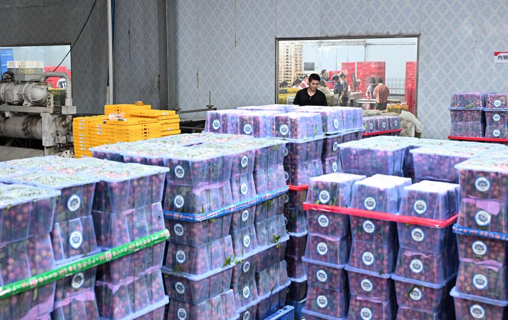 ↑6月4日,在廣東茂名高州市廣東銘景農(nóng)業(yè)發(fā)展有限公司,工作人員在車間分揀荔枝。