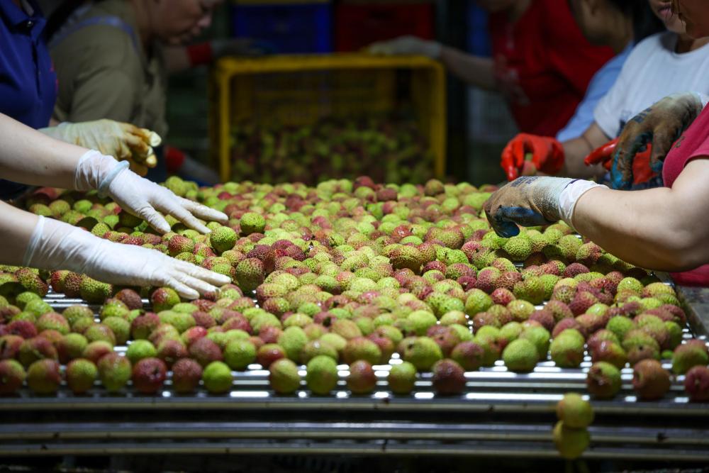 ↑6月4日,在廣東茂名高州市廣東銘景農(nóng)業(yè)發(fā)展有限公司,工作人員在車間分揀即將運往海外的荔枝。
