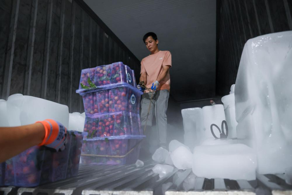 ↑6月4日,在廣東茂名高州市廣東銘景農(nóng)業(yè)發(fā)展有限公司,工人將荔枝裝入放置了冰塊的冷鏈車。