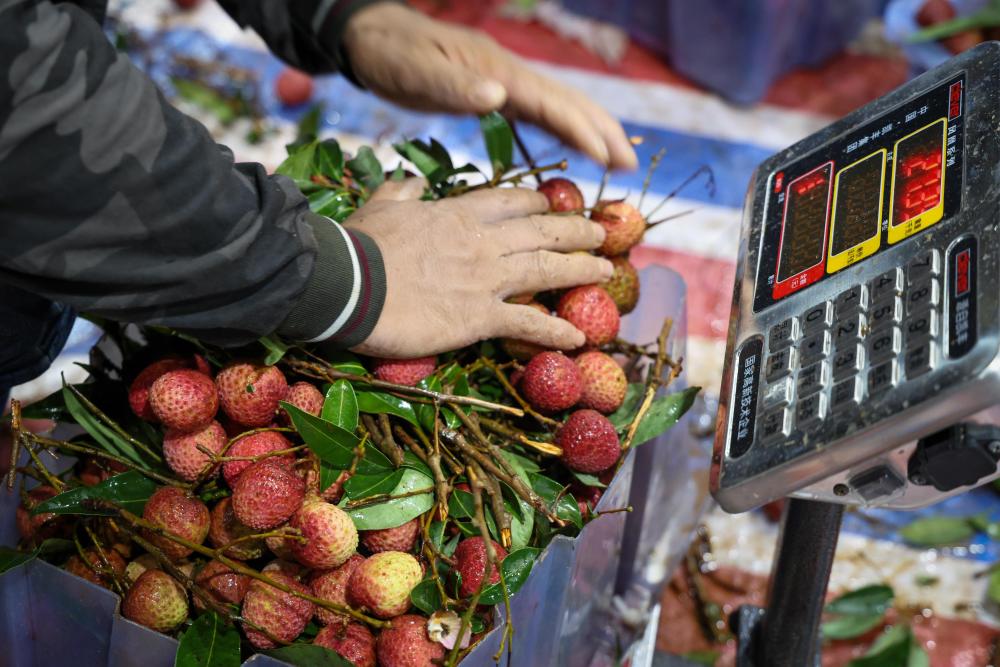 ↑6月4日,在廣東茂名高州市廣東銘景農(nóng)業(yè)發(fā)展有限公司,工作人員對即將運往海外的荔枝進(jìn)行稱重。