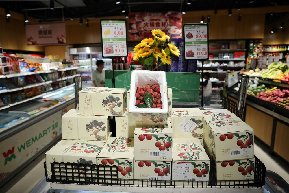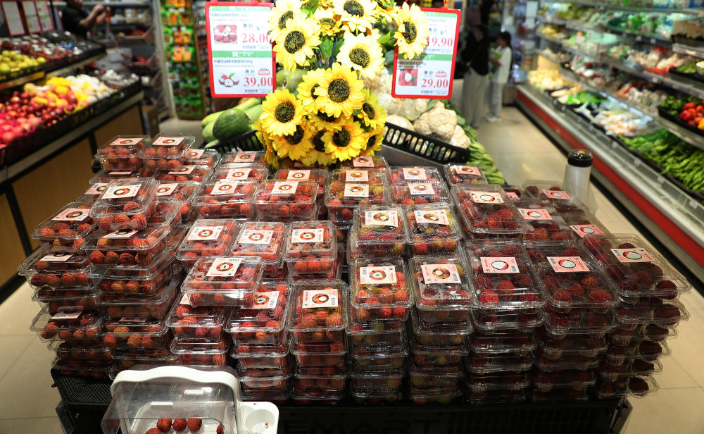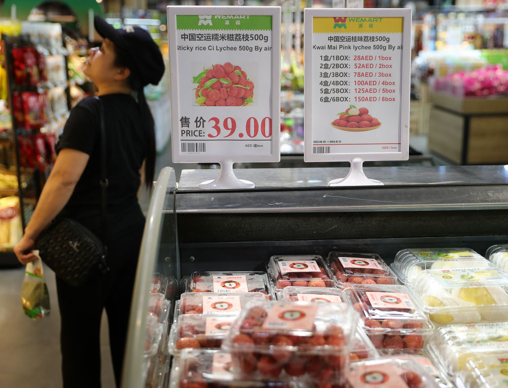 ↑6月20日,在阿聯(lián)酋迪拜溫超超市,消費者選購荔枝。