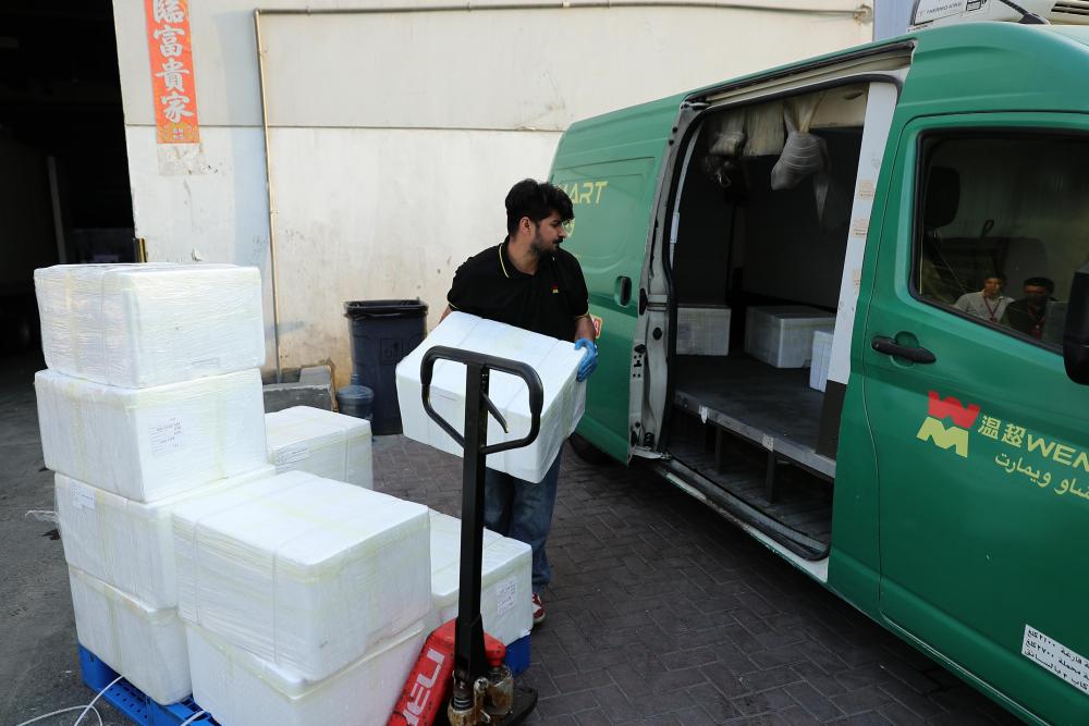 ↑6月20日,在阿聯(lián)酋迪拜溫超超市倉庫,工作人員將剛剛空運到貨的荔枝搬上貨車,準(zhǔn)備運至門店銷售。