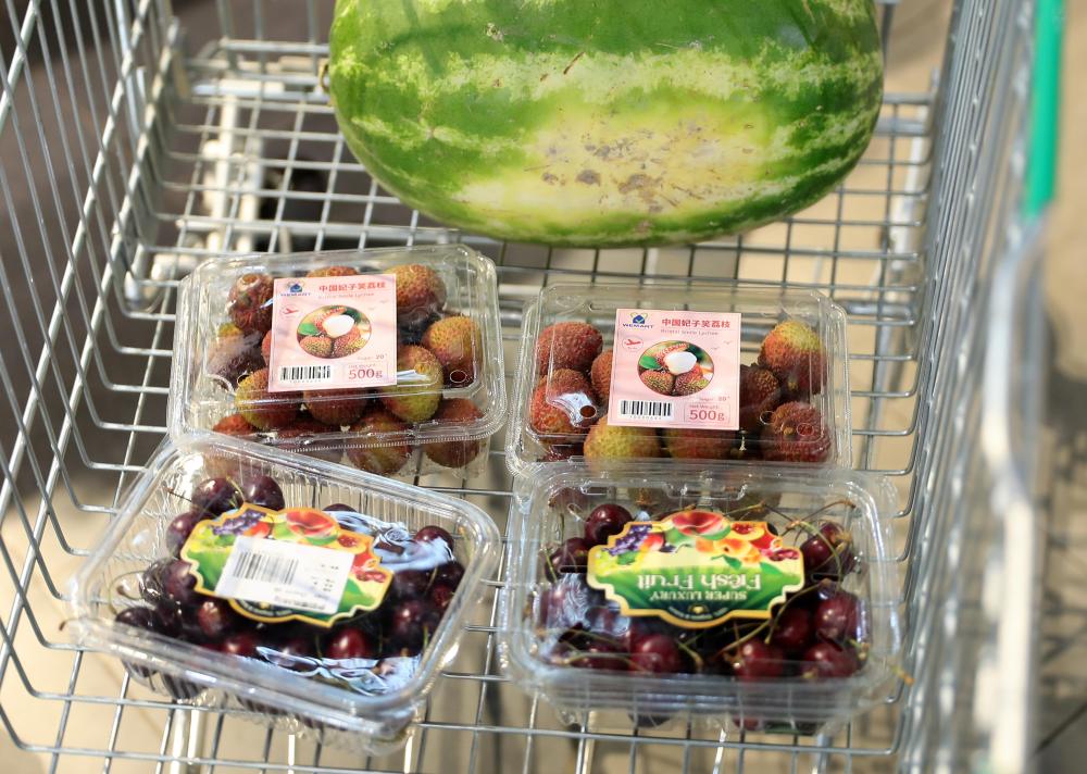 ↑這是6月21日在阿聯(lián)酋迪拜溫超超市拍攝的荔枝貨架。