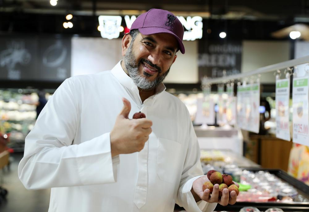 ↑6月21日,在阿聯(lián)酋迪拜溫超超市,菲律賓裔顧客品嘗荔枝后豎起大拇指。