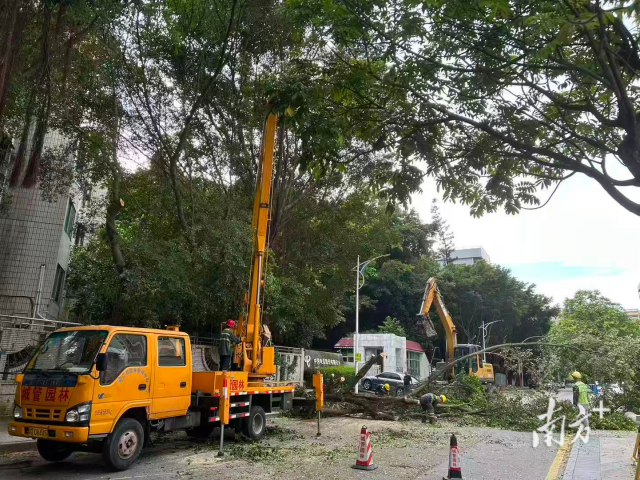 臺(tái)風(fēng)來臨前,園林部門工作人員正在對樹枝進(jìn)行裁剪。受訪者供圖