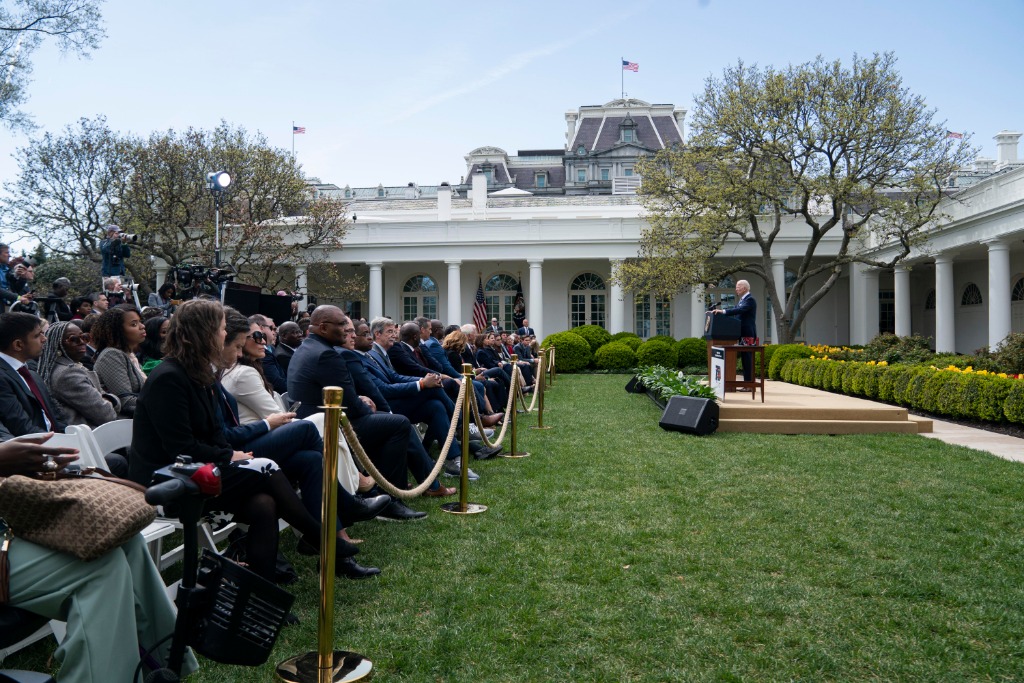 2022年4月11日,美國總統(tǒng)拜登(右一)在華盛頓白宮就監(jiān)管“幽靈槍”的新規(guī)發(fā)表講話。新華社記者劉杰攝