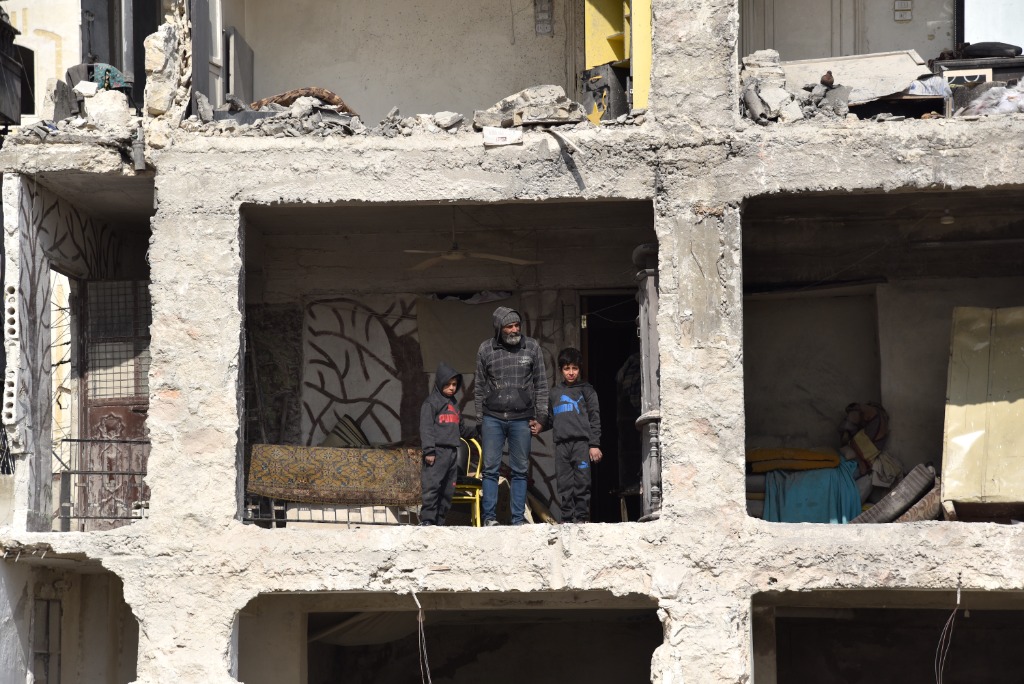 2月13日,在敘利亞地震災(zāi)區(qū)阿勒頗,人們站在受損的建筑中向外張望。新華社發(fā)(蒙塞夫攝)