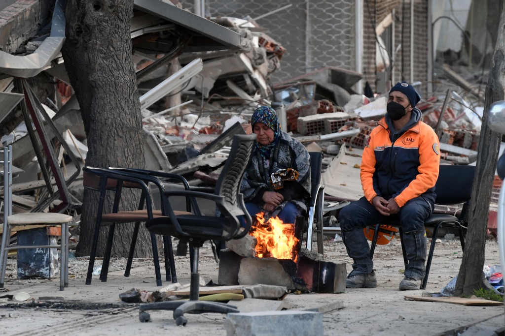 2月21日,在土耳其哈塔伊省,人們坐在震后廢墟旁。新華社發(fā)(穆斯塔法·卡亞攝)