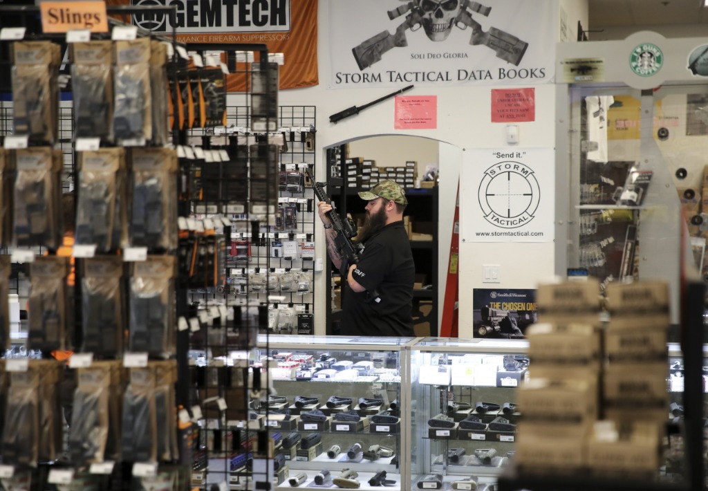 2017年10月4日,在美國拉斯維加斯的“新前線”槍械商店,一名店員為顧客展示槍支!靶虑熬”是當(dāng)?shù)匾?guī)模較大的一家槍械商店,售賣槍支彈藥、槍周邊用品、槍文化衍生品等。新華社記者王迎攝