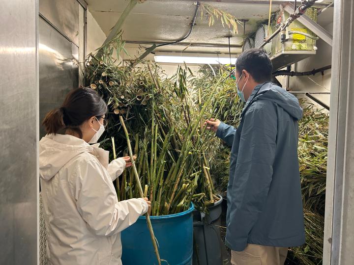 北京動物園工作人員正在檢查“丫丫”食用的竹子 (4月12日攝)