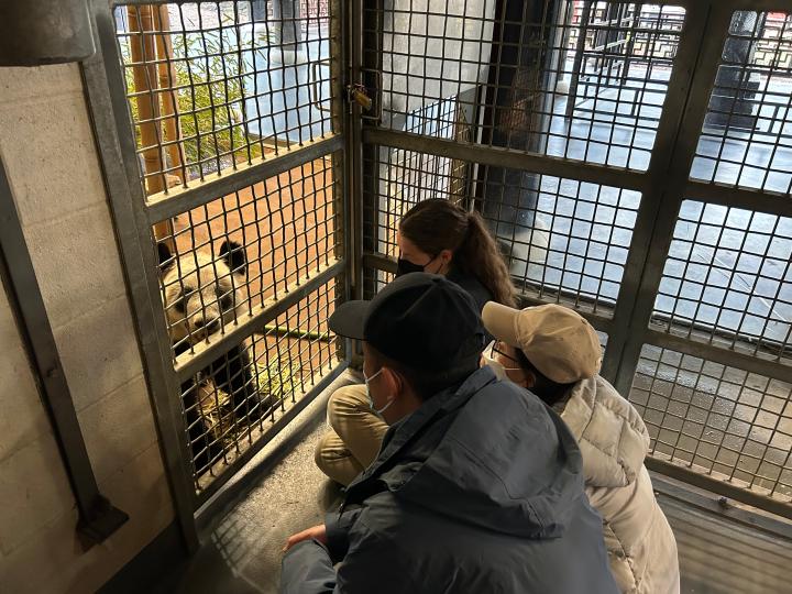 北京動物園工作人員和孟菲斯動物園工作人員一起同“丫丫”增進熟悉度(4月11日攝)