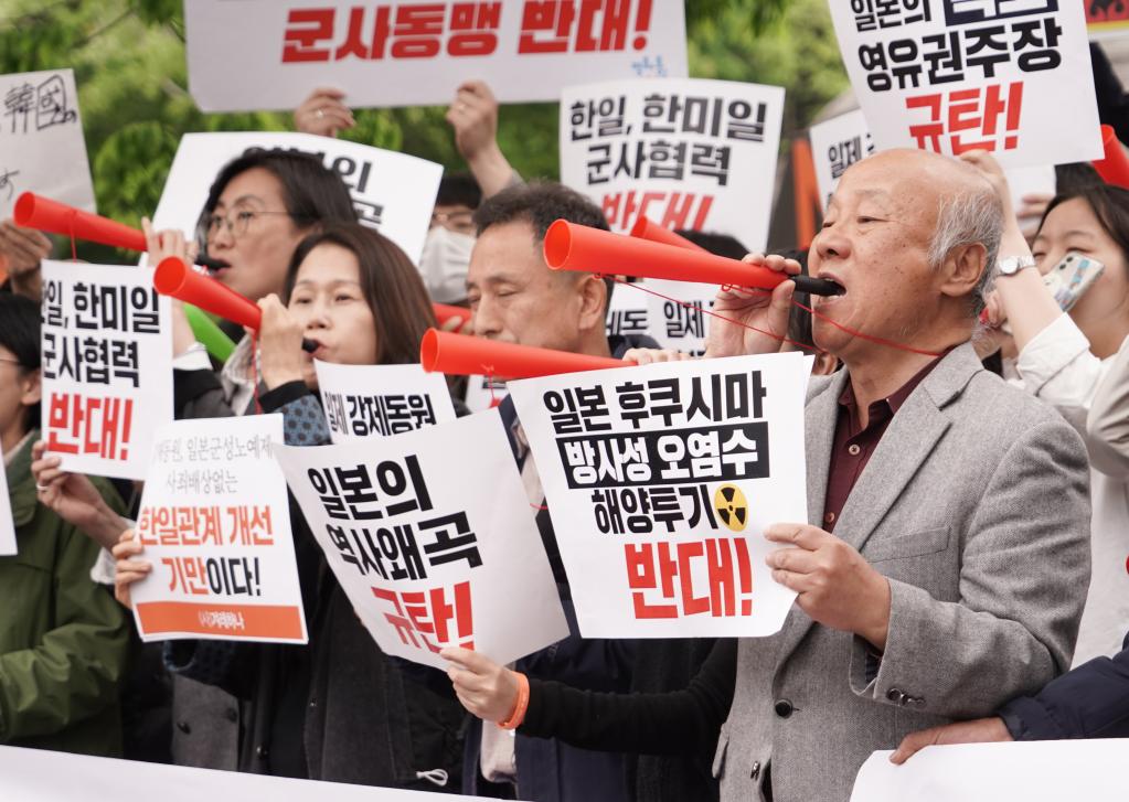 在韓國總統(tǒng)府前的集會現(xiàn)場,民眾手持“停止構(gòu)建韓美日同盟”“停止對日屈辱外交”“立即撤回核污染水排海計劃”等標(biāo)語。他們要求日本政府對二戰(zhàn)期間的殖民統(tǒng)治進(jìn)行道歉并給予賠償,強(qiáng)烈呼吁停止擴(kuò)大韓美日三方軍事合作,共同維護(hù)地區(qū)和平穩(wěn)定。
