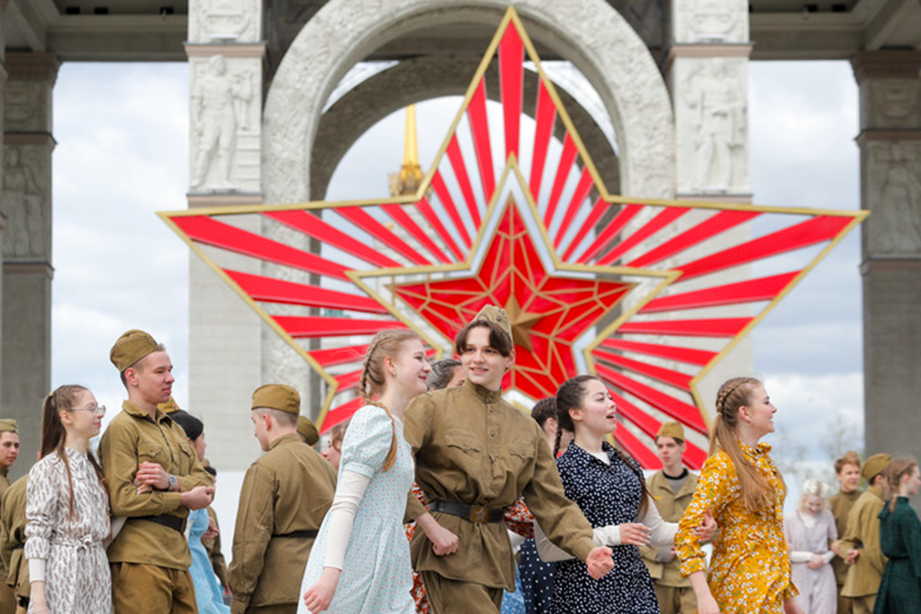 5月6日,在俄羅斯首都莫斯科,學(xué)生們參加“勝利華爾茲”活動。(亞歷山大攝)